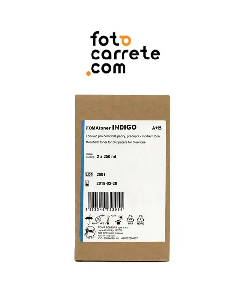 En FotoCarrete operamos con el rigor innegociable de un laboratorio analógico en activo. Custodiamos cada caja de Foma en estanterías permanentemente climatizadas a 20°C y aisladas de la radiación UV. Te garantizamos que ambas botellas de tu Fomatoner Indigo llegarán cristalinas, frescas y con una capacidad de reacción y tinción al 100%.